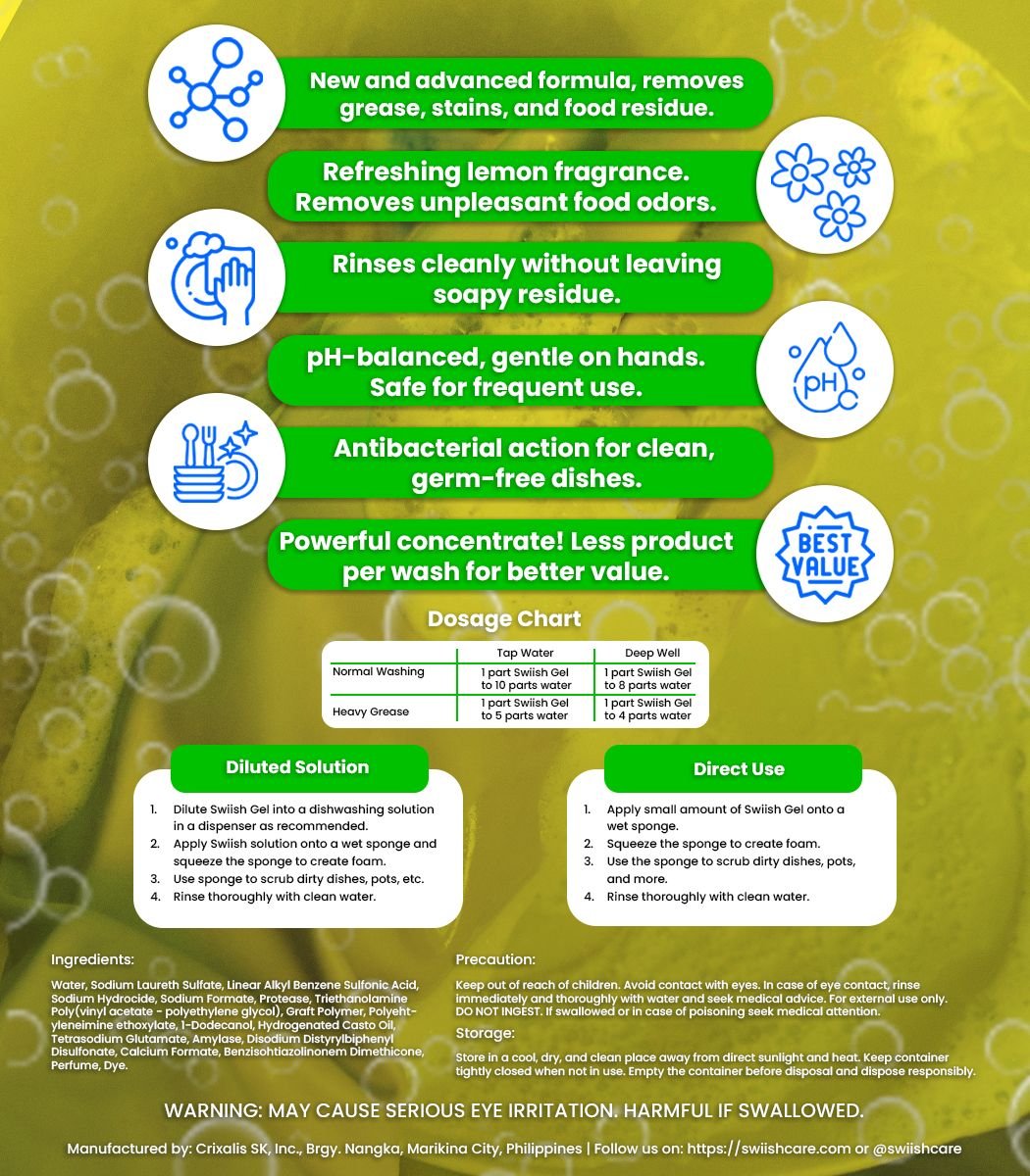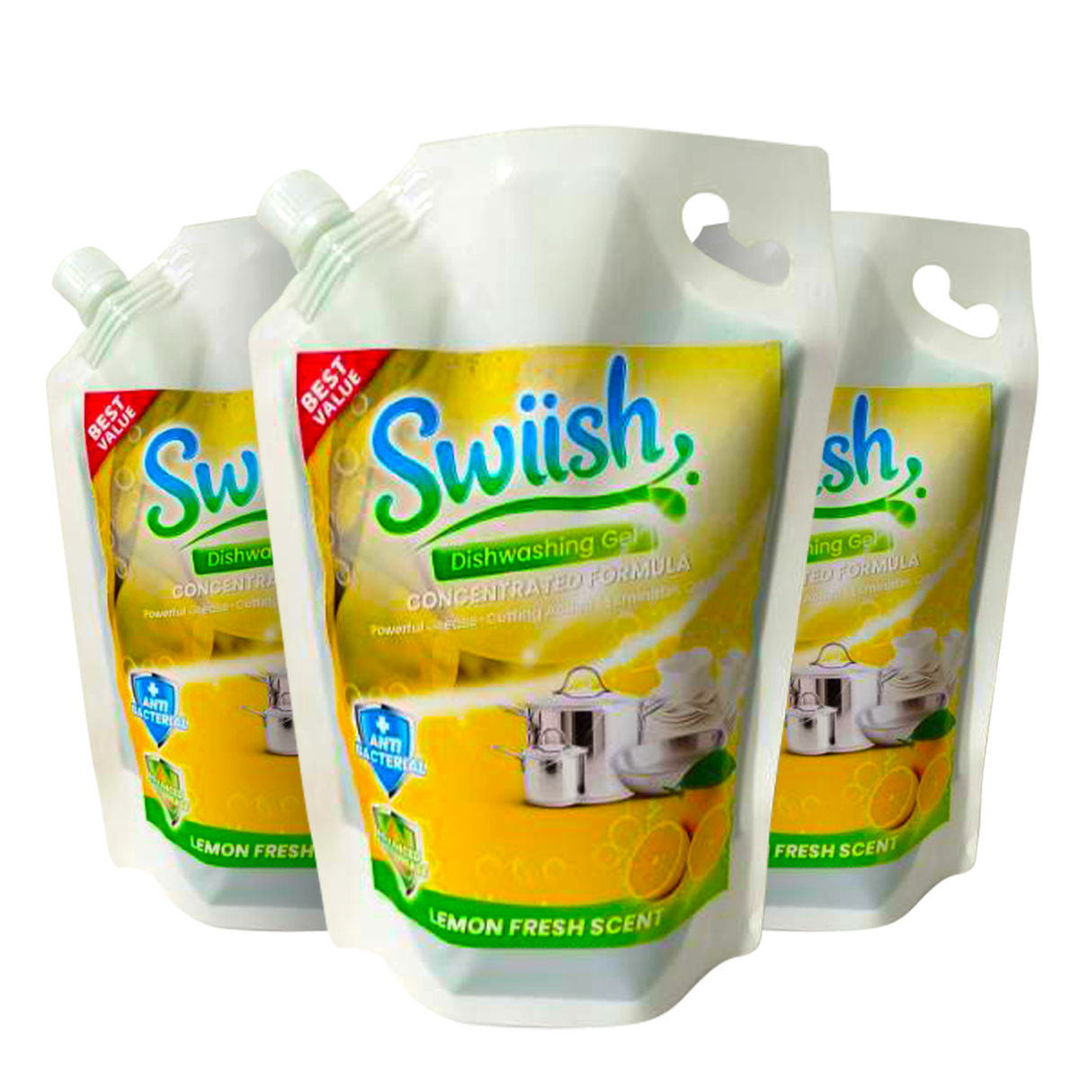 Swiish Dishwashing Gel is a kitchen care solution formulated to deliver exceptional cleaning, hygiene, and user comfort. Its concentrated, skin-friendly formula delivers powerful grease and grime removal and antibacterial protection while using less product per wash, offering outstanding value for money. Designed to overcome common dishwashing challenges or pain points such as stubborn grease, lingering odors, and skin irritation, Swiish combines affordability with dependable dish cleaning power that is on par with top global brands, making it the ideal choice for families and households that demand quality but without the premium price tag. Product Description Swiish Dishwashing Gel is a concentrated manual dishwashing gel formulated to: